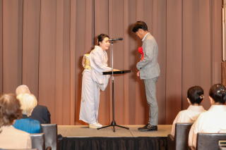 西村翠雲副会長、和歌山県いけばな協会 岡田芳和会長、茶華道タイムス社 山口夏子様を迎え、イリスウオーターテラス菖蒲池にて記念式典・祝賀会を行いました。